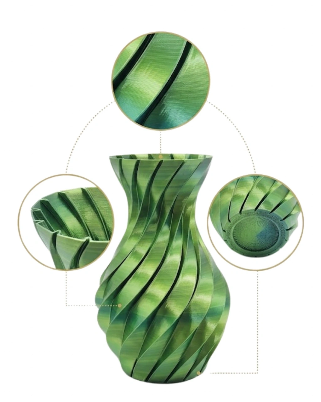 Yaşam alanlarınıza modern bir dokunuş katmak istiyorsanız, yeşil spiral 3D vazo tam aradığınız parça. Özgün tasarımı ve dikkat çekici spiral formu sayesinde bulunduğu ortamda fark yaratır. Canlı yeşil rengi doğadan ilham alarak mekâna enerji ve ferahlık katar.Es görünümünün yanı sıra kullanışlı yapısı ile de öne çıkar. Hafif ve sağlam yapısı sayesinde farklı alanlarda rahatlıkla kullanılabilir. Salon sehpası, TV ünitesi, raf veya masa üzerinde dekoratif obje olarak konumlandırılabilir.Modern, minimal ve çağdaş dekorasyon tarzlarıyla uyum sağlayan bu vazo, hem günlük kullanım hem de özel dekorasyon düzenlemeleri için idealdir. Şık ve zarif tasarımı ile evinize değer katar.