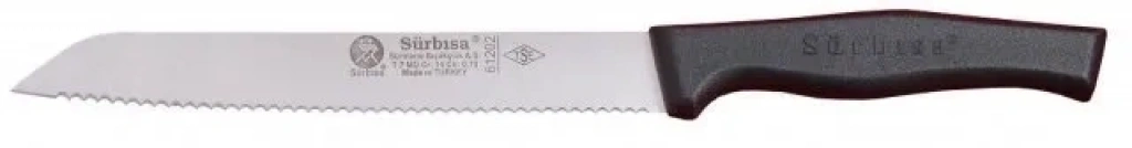 61202, Sürmene&rsquonin ünlü bıçak ustalığını yansıtan yüksek kaliteli bir ekmek bıçağıdır. 19 cm uzunluğundaki bıçağı, özellikle ekmek ve diğer gevrek yiyecekleri kesmek için tasarlanmıştır. Ekmek bıçağı, dişli yapısı sayesinde kabuklu yiyeceklerde mükemmel kesim performansı sunar ve çeşitli mutfak ihtiyaçlarını karşılar.