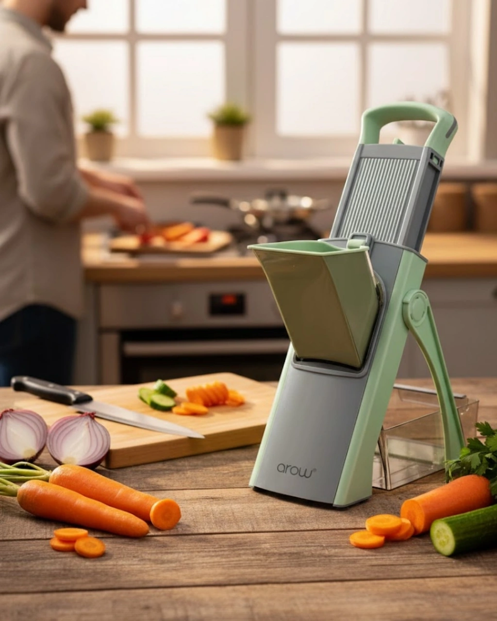 Paslanmaz çelikten üretilmiş bu el rendesi, sağlamlığı ve güvenli yapısıyla mutfakta uzun süreli kullanım sunar. Dayanıklı çelik gövde, günlük doğrama ve dilimleme işlemlerinde yüksek performans sağlar. Keskin ve paslanmaz bıçaklar, farklı sebze ve meyveleri kolayca işlemenize yardımcı olur.Üstte yer alan bastırma atı, kullanıcıya kontrollü ve dengeli bir doğrama deneyimi sunar. Bu yapı sayesinde eliniz doğrudan bıçaklarla temas etmez ve güvenli kullanım ön planda tutulur. Ergonomik tasarım, hem sağ hem sol el kullanımına uygundur.Katlanabilir kompakt tasarım, ürünü kullandıktan sonra rahatça saklamanızı sağlar. Temizlik fırçası, bıçak aralarında kalan parçaları zahmetsizce temizlerken, yiyecek toplama kabı mutfak tezgâhının dağılmasını önler. Şık ve modern görünümüyle mutfağınıza es bir katkı sağlar.