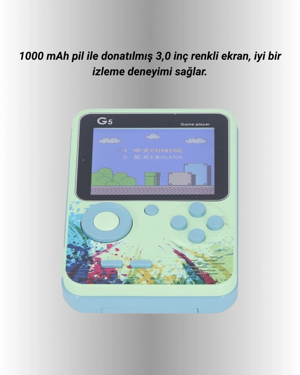Gelişmiş renkli 3 inç LCD ekranı, oyun deneyimini daha net ve canlı hale getirirken, ergonomik tuş yerleşimi sayesinde uzun süreli kullanımda konfor sağlar. Oyunlar doğrudan cihazın hafızasına yüklü olarak geldiği için ekstra indirme, kurulum veya internet bağlantısına gerek yoktur.USB kablo ile şarj edilen dahili bataryası, tek şarjla uzun süreli kullanım sağlar. Elektrik bağımlılığı olmadan özgürce oyun oynayabilirsiniz. Dayanıklı plastik kasası, düşmelere ve çizilmelere karşı dirençlidir. G5 Game Box, hem geçmişin oyunlarını yaşatmak isteyen yetişkinler hem de keşfetmeye hevesli çocuklar için eğlenceli, kullanışlı ve duygusal değeri yüksek bir cihazdır.