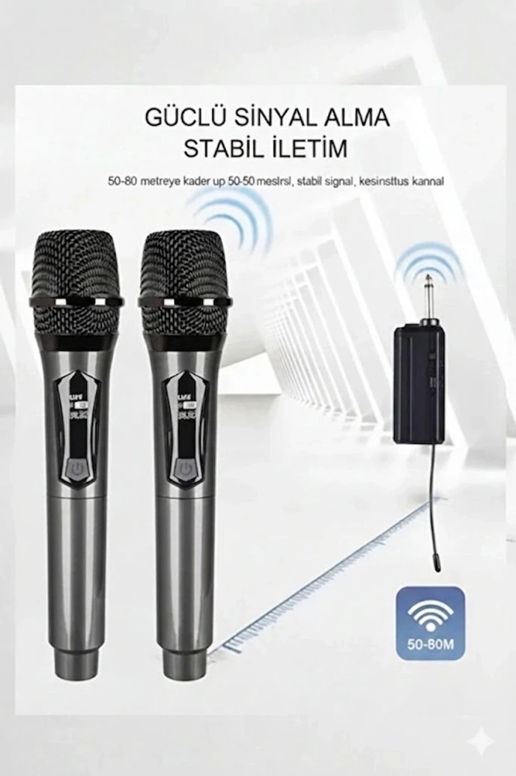 Profesyonel Çiftli Kablosuz Mikrofon Seti Karaoke Şarj Edilebilir 50 Metre