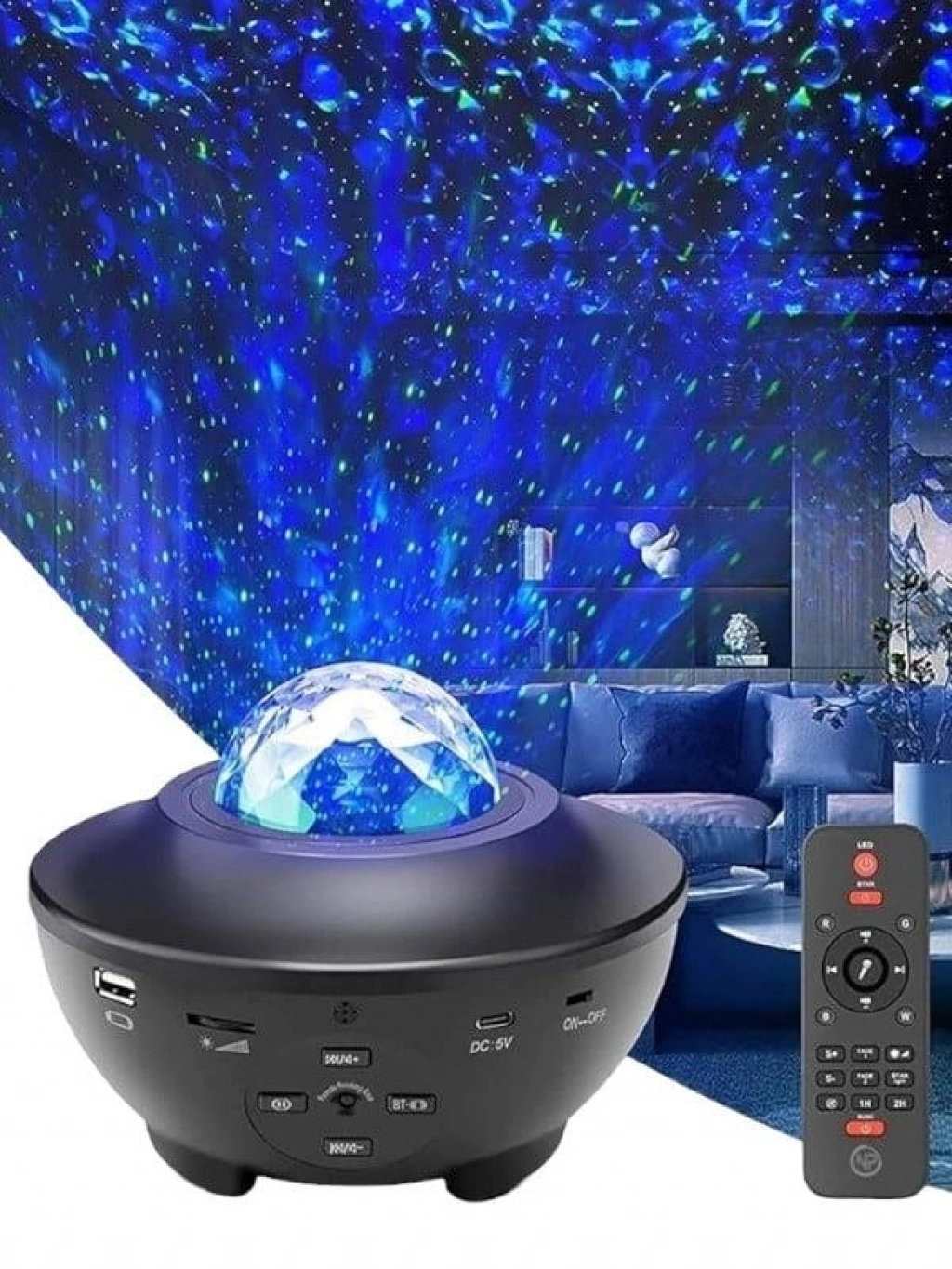 * 10 renk dinamik projeksiyonlar: beş standart renk, kırmızı su dalgası, mavisu dalgası, yeşil su dalgası, beyaz su dalgası ve yeşil lazer noktası, her ikirenk karıştırılabilir ve her iki su dalgası rengi de yeşil lazer noktası ilekarıştırılabilir, Böylece en fazla 10 renk alabilirsiniz. Size muhteşem biryıldızlı ışık göstermek için, farklı hızların dinamik gece projeksiyonu ilekombine çeşitli renkler, rahat, romantik, renkli bir uzay projeksiyon ortamıyaratmak.* Uzaktan kumanda ve müzikal: uzaktan kumanda ile (2XAAA pil kullanın-dahildeğildir), gece ışığını açmak veya kapatmak için yataktan veya kanepedençıkmaktan endişelenmenize gerek yok, uzaktan da yıldız projektör ışık kontroledebilirsiniz, renkli ışıklar, parlaklığı ayarlamak, serbestçe açmak/kapatmaklamba, aydınlatma modunu değiştirmek, Müzik şarkıları, zamanlayıcı. En son sesetkinleştirilmiş titreme modu, projeksiyonun rengi müzik ritmine göredeğiştirmesini veya ellerinizi çırpmasını sağlar ve bu da yıldızlı birprojeksiyon ile sonuçlanır.* Bluetooth hoparlörler ve zamanlayıcılar: favori müziğinizi Bluetooth veya USBüzerinden seçebilirsiniz. Yüksek kaliteli müzik ve yıldızlı projeksiyonlar geceromantik ve yatıştırıcı bir ortam yaratır. Zamanlayıcı seçeneği daha enerjiverimli, ayrıca tüm gece ışığını da atabilirsiniz.* Otomatik kontrol zamanlayıcısı: dinamik bulutsu'nun yıldız projektör ışıkdahili 1H, 2H, otomatik kapanma zamanlayıcısı, gece ışık projektör projektörışık önceden ayarlanmış süreden sonra otomatik olarak kapanacaktır. Ve tabiiki, zamanlayıcı tüm gece boyunca kalmak için iptal edilebilir.* Aile ve çocuklar için hediyeler: yıldız projektör gece lambası doğum günüiçin uygundur, parti, düğün, oda dekor, çocuk günü, noel, yıldönümü hediyeler,harika ve yıldızlı bir atmosfer yaratır, çocukların meraklarını, hayal gücünü,yaratıcılıklarını teşvik etmelerine yardımcı olur. Ayrıca bir okyanus dalgasıprojektör, romantik ruh ışık, gece lambası ve başucu lambası olarak içdekorasyon için mükemmelleştirir.* Müzik yıldızlı gece ışık projektör: yıldızlı gece lambası, bebekler için iyibir uyku ortamı yaratarak, aileniz veya arkadaşlarınız için unutulmaz bir gecegösteren, duvarlara ve tavana gerçekçi bir yıldızlı gece yansıtabilir.